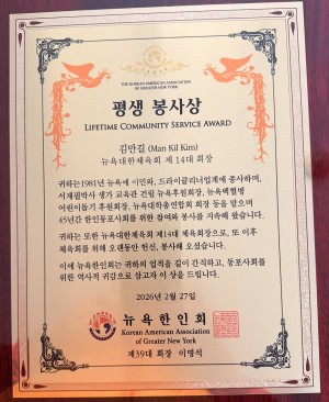 지난 2월 27일 거행된 뉴욕한인회 신년회에서 김만길 선배님이 한인회로 부터 평생 봉사상을 수령했다.김 선배님은 뉴욕 체육회 회장을 역임하면서 동 협회가 어려움을 처할때 마다 강한 리더쉽을 발휘하여 협회 정상화에 기여한바 있다. 그리고 본 인하동문회장과 이사장을 역임하면서 동문회 발전에도 크게 이바지 하였으며 지금까지 누구보다도 본 동문회를 사랑하여 활동에 적극 적이다. 다시한번 더 김선배님의 수상을 전 뉴욕 인하인들과 함께 축하한다